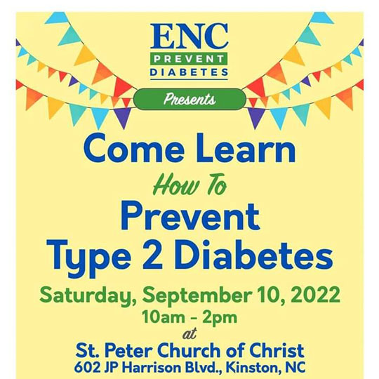 ENC Prevent Diabetes held a "Come Learn How To Prevent Type 2 Diabetes" event on Saturday, September 10, 2022 at St. Peter Church of Christ in Kinston. The event featured free food, giveaways, face paintings, A1C testing and a visit from KISS 102 FM.